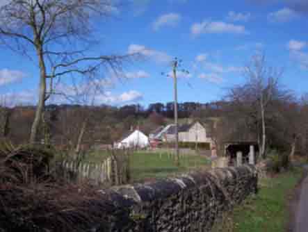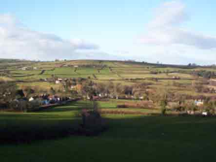 The catchment area at the head of the valley, with ancient field system on the hillside. The Mill is downstream to the right.