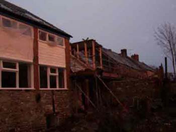 Captured in an evening sun, the bridge to connect the main building with the new tower. The tower will be built on the existing masonry walls at right, which formerly |